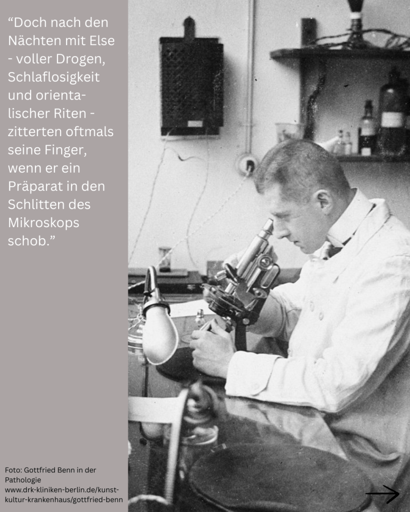 Er ist nicht gern Assistenzarzt in der Pathologie in Berlin. An den Abenden schüttelt er sein Alltags-Ich ab, verkehrt in den Cafés der Bohème, wo er den literarischen Austausch pflegt und seine Geliebte trifft: die exzentrische Else Lasker-Schüler. Aber auch die Liebesbeziehung macht ihn nicht glücklich. Lasker-Schülers Intensität ist ihm zu viel, die Drogenexzesse zehren an ihm. Er sucht ein anderes Leben.