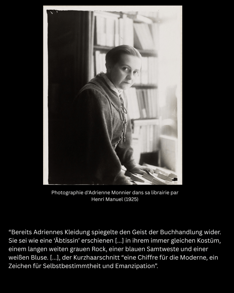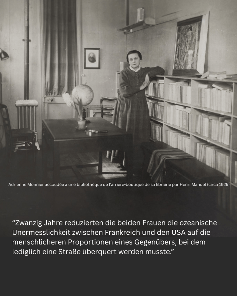 Nicht ganz so berühmt, aber von enormer Bedeutung für die französische Literatur ist die Inhaberin der anderen legendären Buchhandlung. Die Schriftstellerin und Buchhändlerin Adrienne Monnier ist nach den Worten Neumahrs zwar nicht in der Liste der „Gerechten unter den Völkern“ zu finden, aber sie sei dieser Ehre eigentlich würdig. Ihr idealistisches humanitäres Engagement sei bisher viel zu wenig beachtet worden. Sie war eine einnehmende Persönlichkeit mit einer ausgeprägten sozialen Ader. Ihre Begeisterung für die Literatur war so ansteckend, dass ihr Laden der „heimliche […] Mittelpunkt der französischen Kulturszene in den Zwanzigerjahren“ wurde. Hier lasen oder stritten sich Paul Claudel, André Gide, André Breton, Jean Cocteau, Paul Valéry und viele andere.
