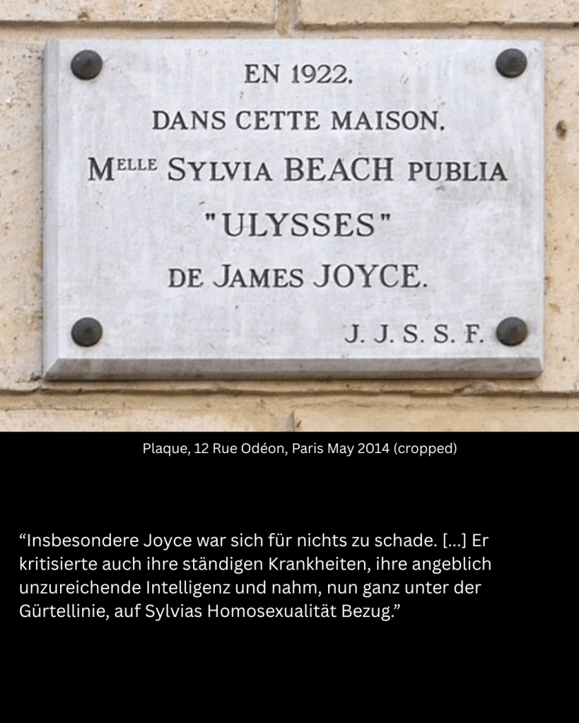 Die Amerikanerin Sylvia Beach und ihre Buchhandlung mit Leihbücherei ist vor allem durch die Veröffentlichung von James Joyces Jahrhundertroman „Ulysses“ berühmt geworden. Weniger bekannt ist, dass der Autor sich später äußerst undankbar erwies. Neumahr erzählt ausführlich davon, wie der großspurige Joyce sie wegen der Tantiemen und der Rechte bedrängte und selbst vor Beleidigungen nicht zurückschreckte.