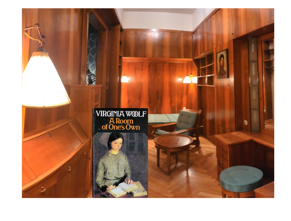 „1925 wird die Architektin Margarete Lihotsky mit der Gestaltung eines Ruheraums beauftragt. […] Indem sie den Großteil des Mobiliars in die Wandarchitektur integriert, gelingt es der Architektin, auf engstem Raum eine Schafnische, einen Toilettetisch, einen Schreibtisch, Schränke, Regale und verschiedene Sitzmöbel unterzubringen. […] Im selben Jahrzehnt, in dem die englische Schriftstellerin Virginia Woolf ihren Text „A Room of One’s Own“ schreibt, schafft Margarete Lihotsky mit diesem Zimmer einen privaten und eleganten Rückzugsraum …“ (Text: MAK)